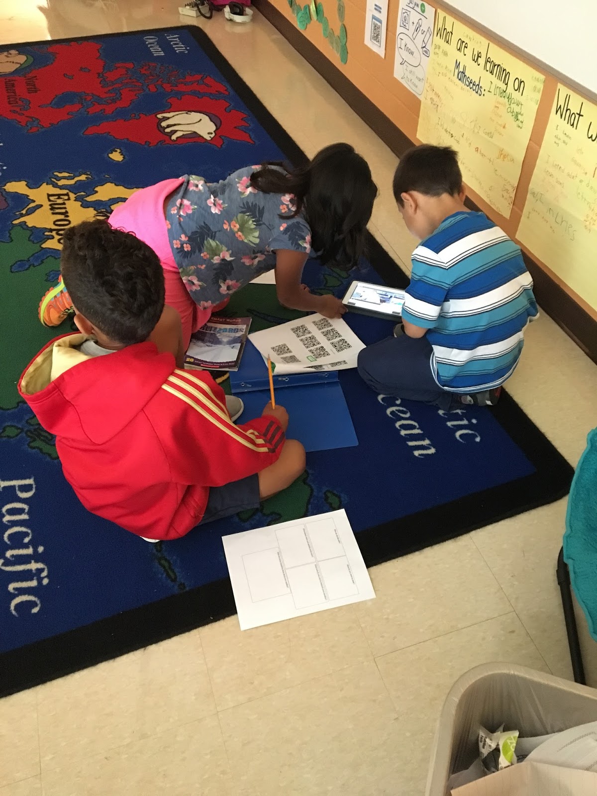 The next week we dove right into our partner work for our PBL. For this PBL, students were grouped into groups of three. Each member of the group had a job. The jobs were news anchor, meteorologist, and safety expert. Each group was assigned one weather pattern and a location that it occurs. Students had a list of QR codes and books to do research on their topic. They also had a graphic organizer to help them take notes on their weather pattern. Here is a list of the QR codes: